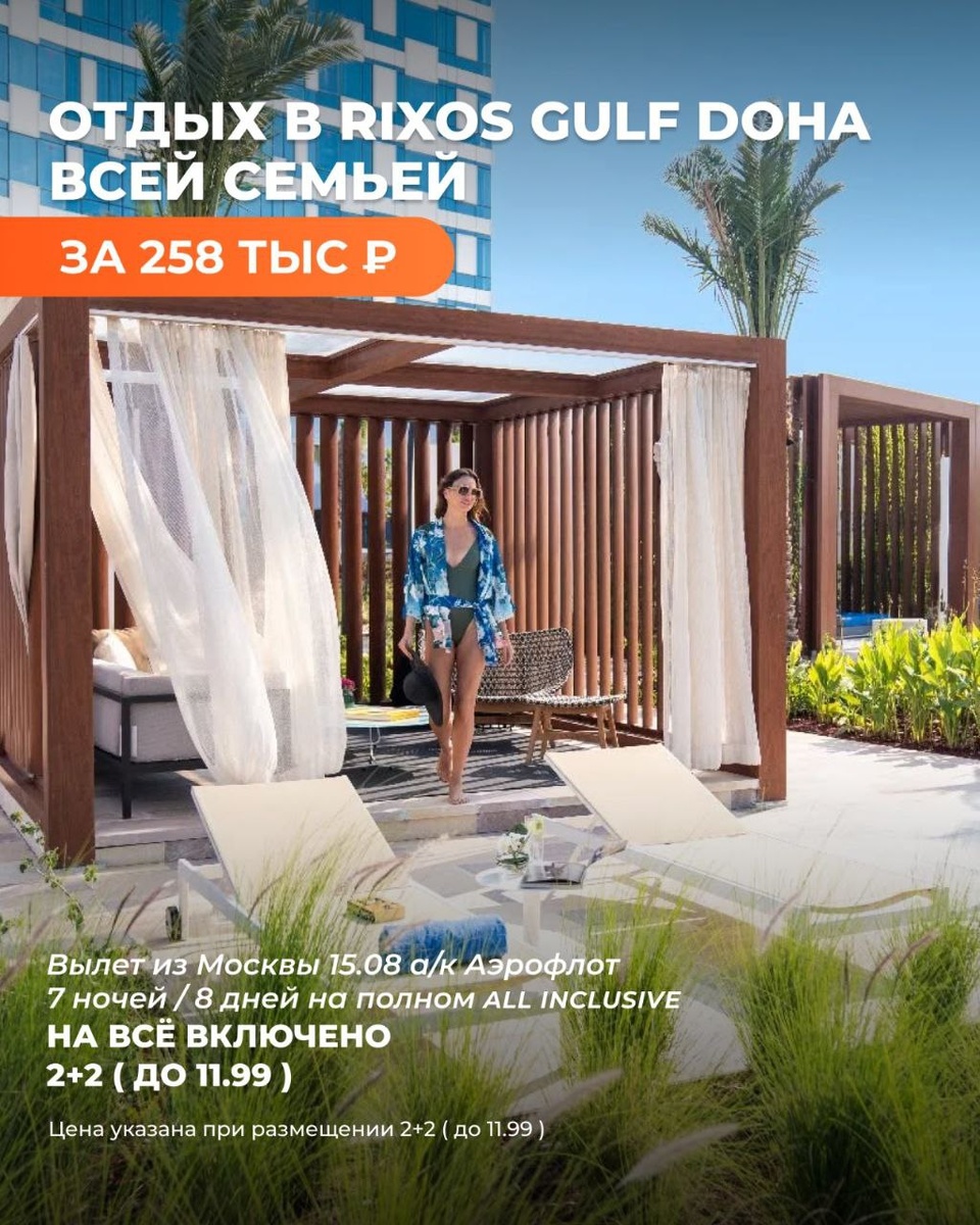 🏢 Rixos Gulf Hotel Doha 5* — роскошный пляжный курорт в Дохе с системой «всё включено». Отель предлагает стильные номера, собственный песчаный пляж, бассейны, спа-центр, рестораны мировой кухни и разнообразные развлечения. Удобное расположение рядом с достопримечательностями и аэропортом делает его идеальным выбором для семейного отдыха и романтических поездок._