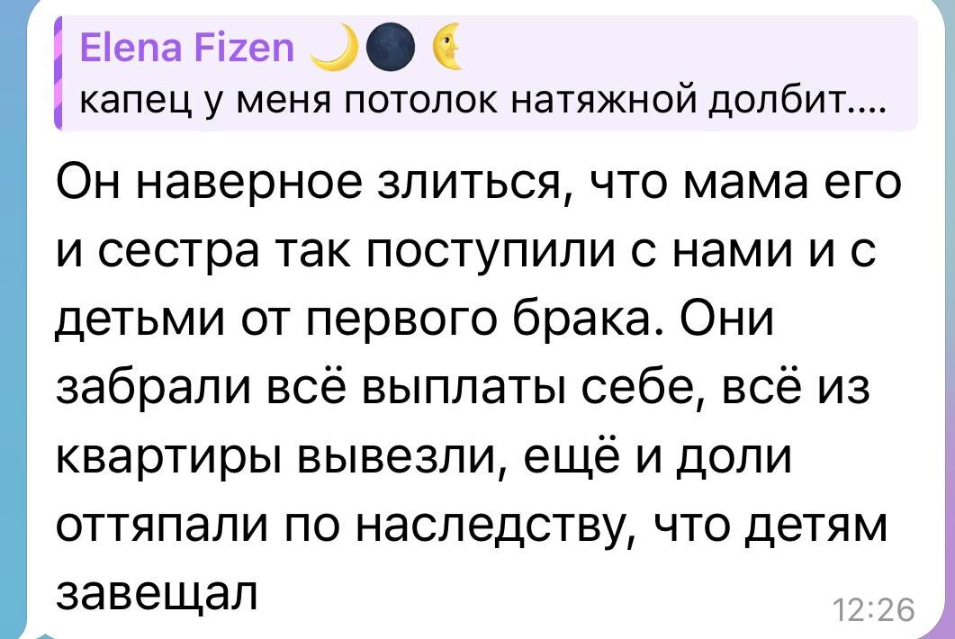 💁🏻♀️- Он наверное злится, что мама его и сестра так поступили с нами и с детьми от первого брака. Они забрали всё выплаты себе, всё из квартиры вывезли, ещё и доли оттяпали по наследству, что детям завещал.