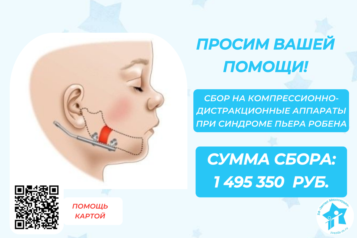 Дорогие друзья! Мы обращаемся к вам с важной просьбой о помощи. В нашем фонде «Звезда Милосердия» продолжается сбор средств на приобретение компрессионно-дистракционных аппаратов для лечения детей с синдромом Пьера Робена. Этот врождённый порок развития требует срочного и квалифицированного медицинского вмешательства, что позволит детям нормально дышать и питаться. Синдром Пьера Робена проявляется тремя основными признаками: - Недоразвитие нижней челюсти - Расщелина нёба - Глоссоптоз (западение языка) Без необходимого лечения дети могут столкнуться с жизнеугрожающими состояниями. Об этом мы подробно рассказываем тут. Кстати, нам очень приятно, что вы читаете наши посты о данном заболевании – ведь 69% наших подписчиков и читателей в недавнем опросе ответили, что знают для чего нужны дистракционные аппараты, а 8% не понаслышке знакомы с этим методом лечения, ведь их детям такие аппараты устанавливали. Лечение детей с синдромом Пьера Робена проводится за счёт бюджетных средств по программ