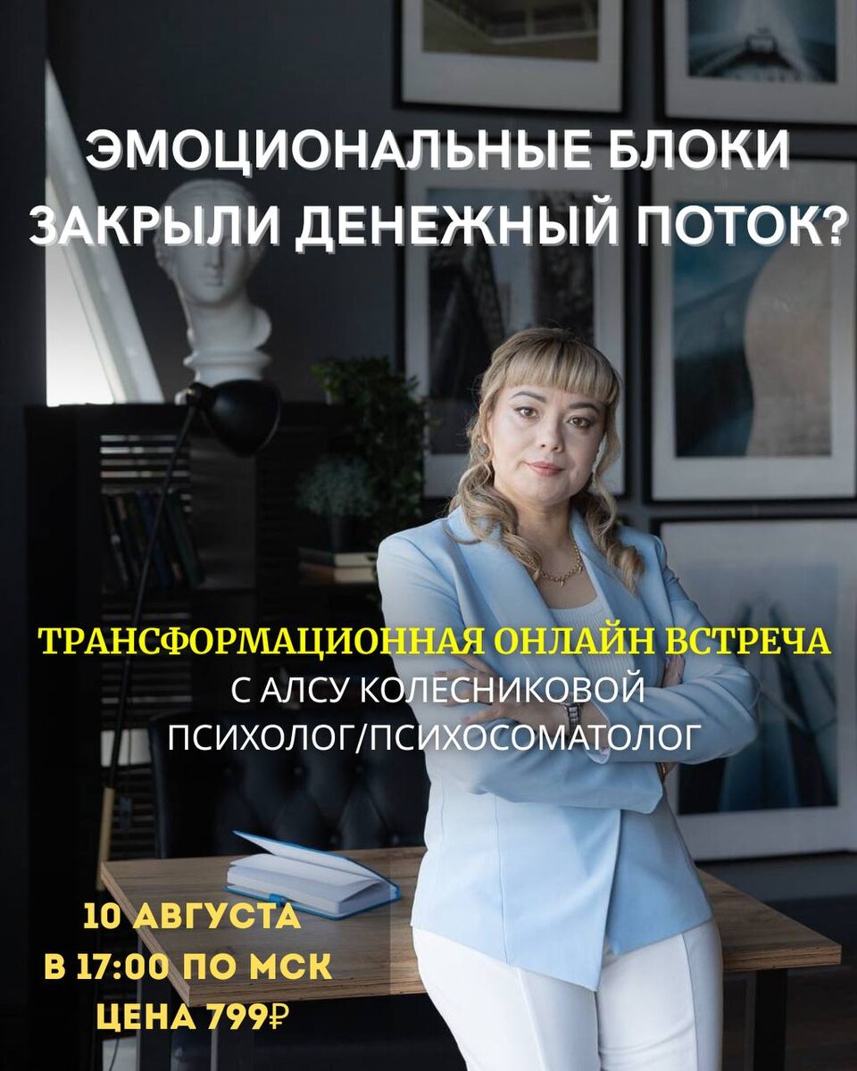 #встречаонлайн Дорогие подписчики, моя коллега Алсу Колесникова, известный психолог -психосоматолог с опытом 11 лет приглашает всех на очень важную онлайн-встречу. Это будет пространство, где мы вместе сможем остановиться, услышать себя и, возможно, понять, что мешает нам чувствовать свободу — и внутри, и в деньгах, и в теле. ⠀ Будем говорить искренне и просто — о жизни, о боли, о внутреннем напряжении, которое мы часто не замечаем, но которое сильно влияет на всё: здоровье, отношения, финансы. ⠀ Что обсудим на встрече : 📍 Где и как блокируется денежный поток 📍 Почему тело говорит с нами болью и симптомами 📍 Как выйти из состояния «я в тупике» 📍 Как эмоции влияют на финансы 📍 Простые телесные практики на расслабление 📍 Быстрые техники восстановления ресурса (5 минут — и ты в себе) 📍 Практика проявленности и уверенности 📍 Метафорические карты «Женщина и деньги» — поработаем с тем, что скрыто ⠀ Завершим всё медитацией «Я — творец своей жизни». Очень мягко и глубоко. ⠀ 📅 10 ав