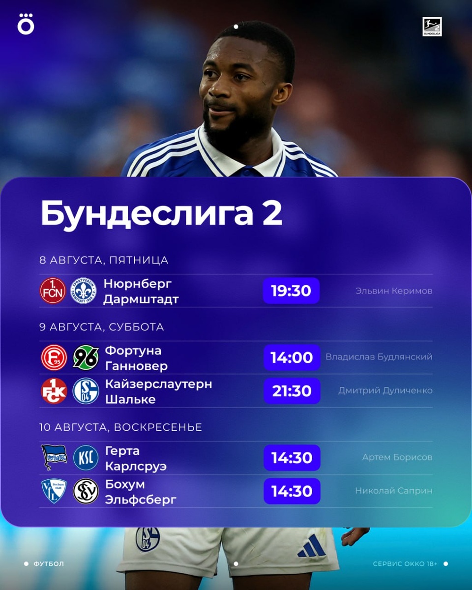 🇩🇪 В предстоящем туре второй Бундеслиги покажем сразу 5 матчей. Пятничный вечер скрасит игра «Нюрнберга» и «Дармштадта». А выходные — матчи «Фортуны», «Шальке», «Герты» и «Бохума». Ищи все в Okko: https://okko.tv/s/sin ⚽️