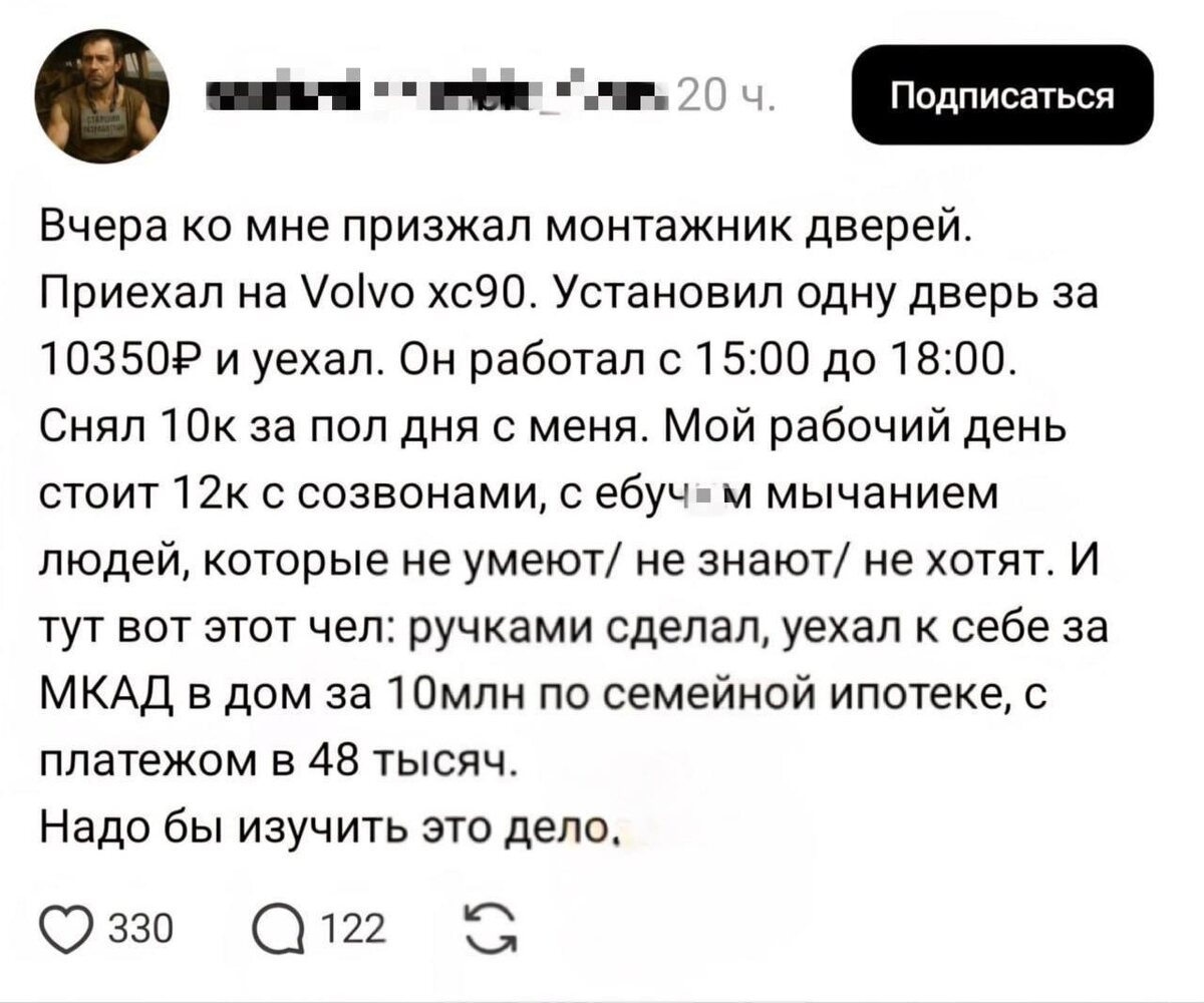 Все так. За замену замка на входной двери я, недавно, заплатил около 15 000 р.... А мастер работал ну минут 35-40. Не знаю, на какой машине он приехал, но жаба меня слегка задушила :) платить такие деньги за такой срок. А что делать? В общем люди, которые умеют работать руками, всегда ценились и будут цениться еще больше... Русский ИТ бизнес