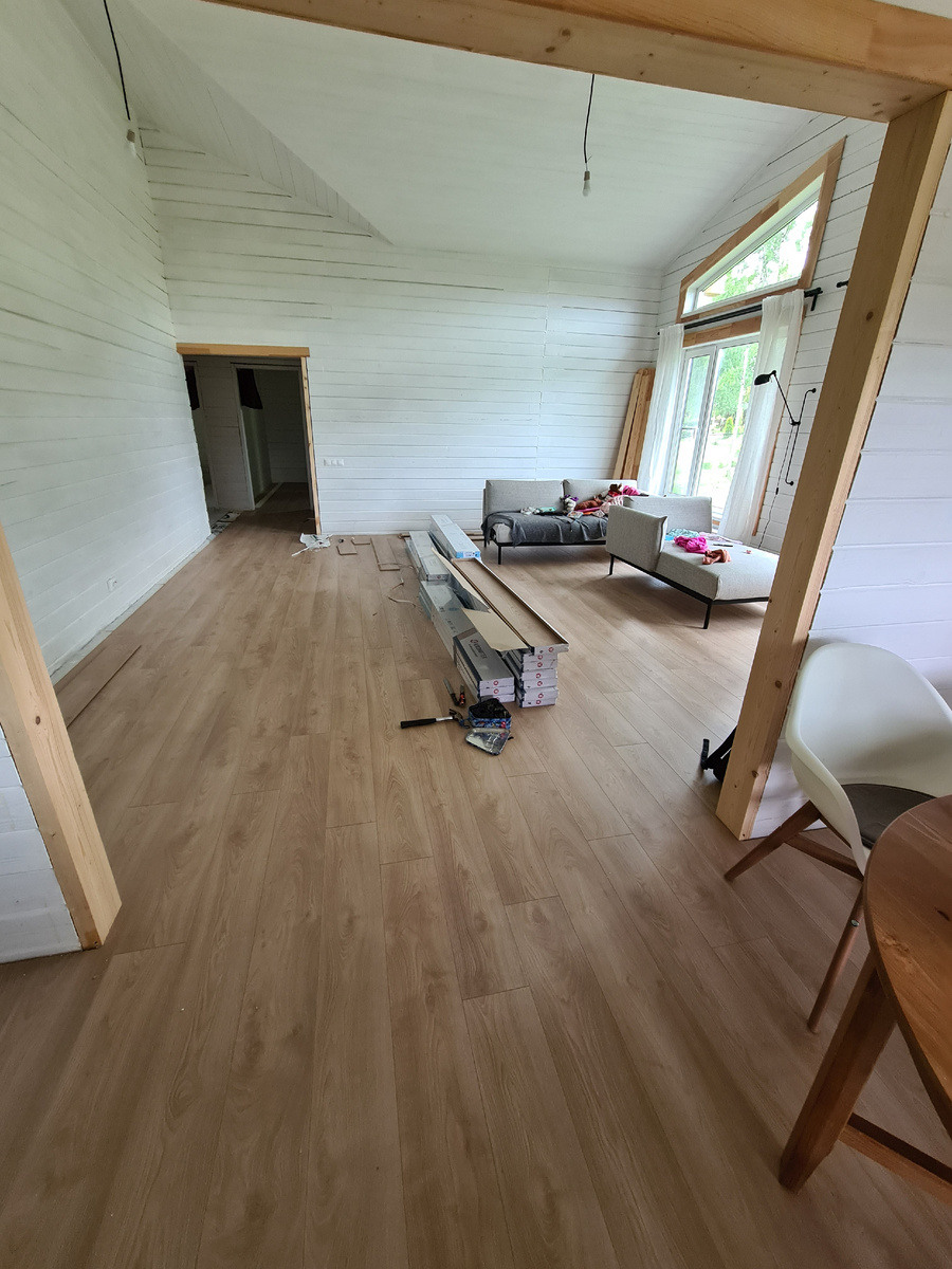 На самом деле можно поменять ламинат, не вынося мебель из комнаты, можно ее просто передвигать по мере укладки ламината. Мы не раз выполняли такую работу: сначала клали ламинат с одной стороны, а мебель на это время сдвигали к стене, потом перемещали мебель на законченную сторону и доделывали все помещение.