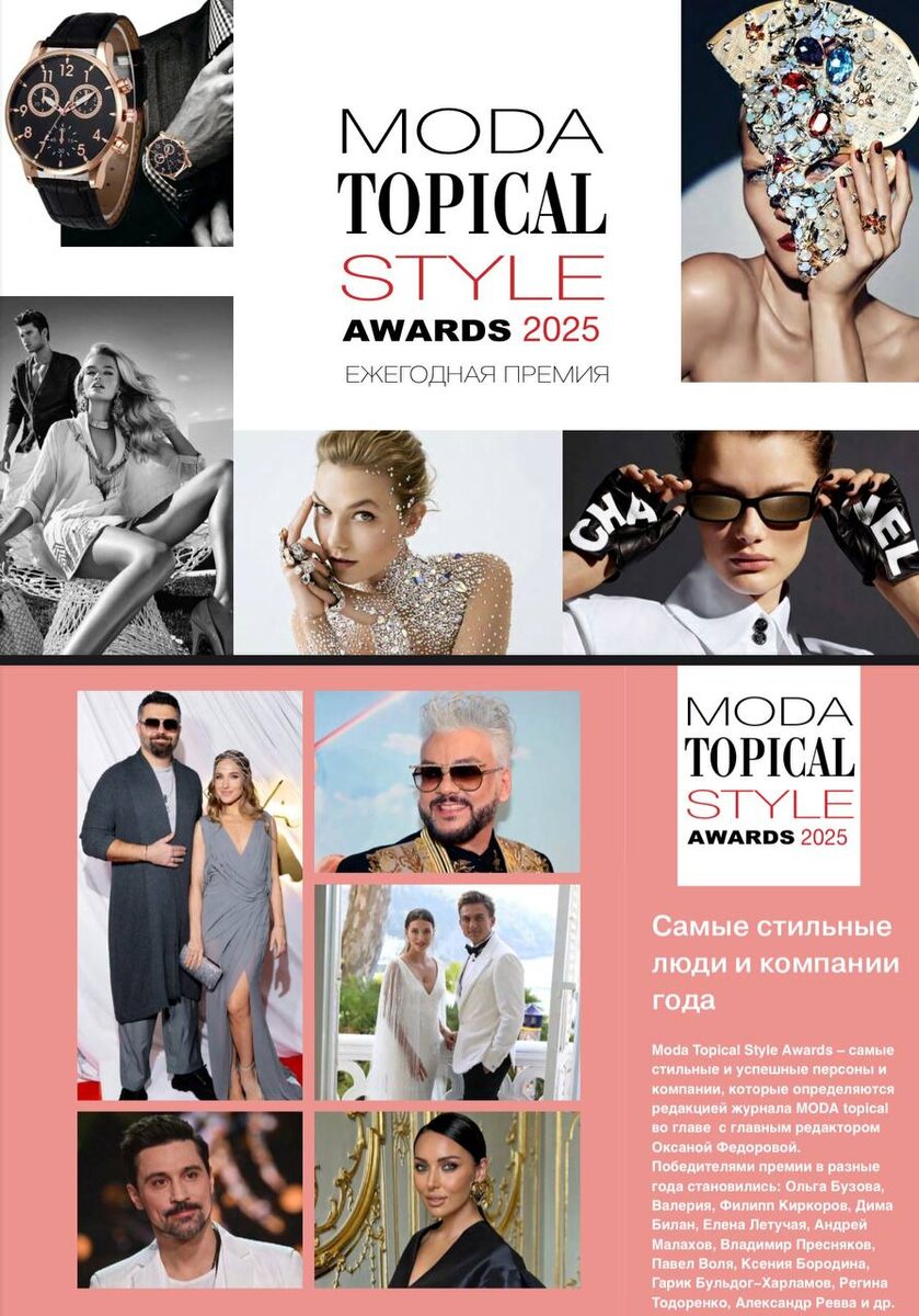 Премия журнала MODA TOPICAL PR-СПОНСОРСКИЕ ПРОГРАММЫ НОМИНАЦИИ Премия соответствует позиционированию Стиль, life style, дизайн, красота Номинанты Topical Style Awards 2025: Мари Краймбрери, Зара, Владимир Пресняков, Валя Карнавал, Филипп Киркоров, Наталья Подольская, Ольга Бузова, Регина Тодоренко и др. Подробности @stf_progres