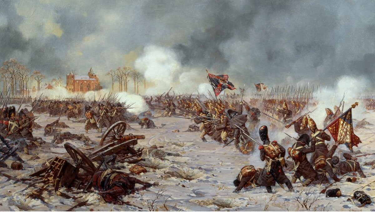 Битва при Прейсиш-Эйлау произошла 7–8 февраля (26–27 января по старому стилю) 1807 года во время русско-прусско-французской войны 1806–1807 гг., став одним из важнейших событий этой кампании. Сегодня этот город называется Багратионовск, находится в Калининградской области Российской Федерации. Это одно из крупнейших столкновений эпохи Наполеоновских войн, которое продемонстрировало силу и стойкость обеих сторон конфликта. 7 февраля. Русские войска были вынуждены противостоять значительно превосходящим силам французов уже накануне основного столкновения. Арьергард русской армии под руководством талантливого генерала Петpa Ивановича Багратиона успешно задерживал продвижение неприятеля на подступах к городу, обеспечивая возможность основным частям русской армии занять удобные оборонительные позиции на возвышенностях севернее города. Эта стратегия позволила выиграть необходимое время и подготовить укреплённые рубежи обороны, что стало важным фактором успеха последующих действий русской арм