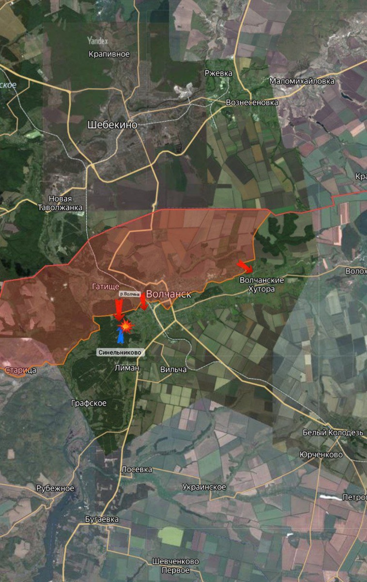 🪖 Харьковское направление Волчанский и Липцовский участки В р-не Волчанска активизировали свою работу расчеты БПЛА противника. Накопив резервы, ВСУ пытается создать встречные бои и вытеснить наши войска с занимаемых позиций, а также обезопасить свои маршруты снабжения. На левом берегу р.Волчья наши штурмовые группы продвинулись до 300 м. в лесных массивах, а также закрепились в трех зданиях в городской застройке. В лесу возле Синельниково подразделения ВС РФ отразили 3 контратаки боевиков ВСУ, уничтожив половину живой силы врага, остальные отступили на исходные позиции. На Липцовском участке фронта ВС РФ сосредоточили усилия на уничтожении минометов и пунктов управления БПЛА. Великобурлукский участок На этом участке фронта в р-не н.п Хатнее наши подразделения результативно отработали ТОСами по скоплениям сил ВСУ. Огнем "Солнцепеков" накрыто 3 позиции врага. Противник активных действий не предпринимал и сосредоточил усилия на укреплении занятых позиций. Потери противника 🪖 Во