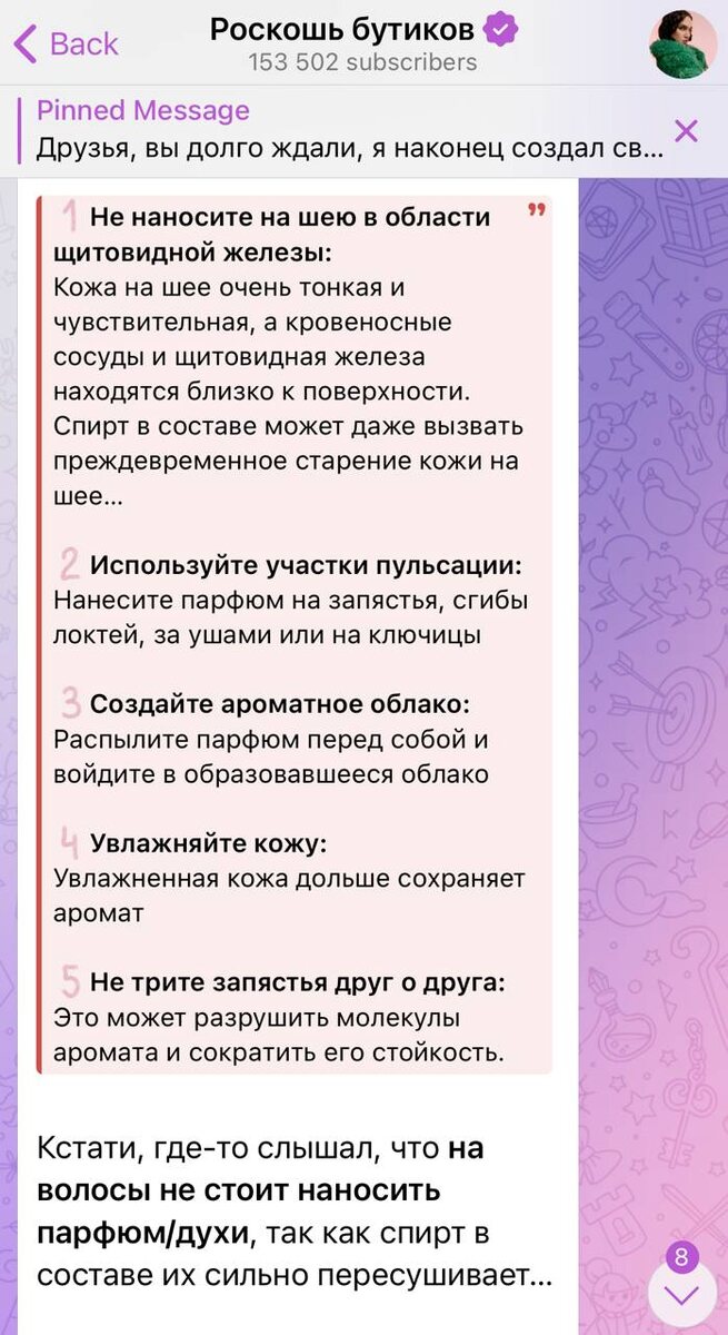 2. Наносите духи, как вам нравится. Хоть точки пульсации, хоть ароматное облачко, хоть желанные для поцелуев места — главное, чтобы вы были довольны, парфюмерия про гедонизм.