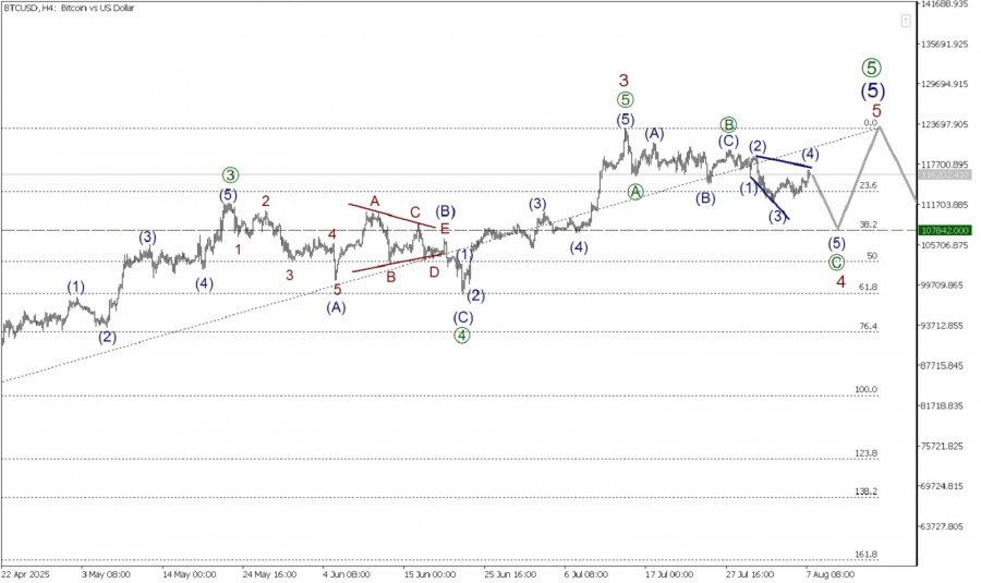 В долгосрочной перспективе по криптовалютной паре BTC/USD может формироваться крупный бычий импульс (1)-(2)-(3)-(4)-(5
