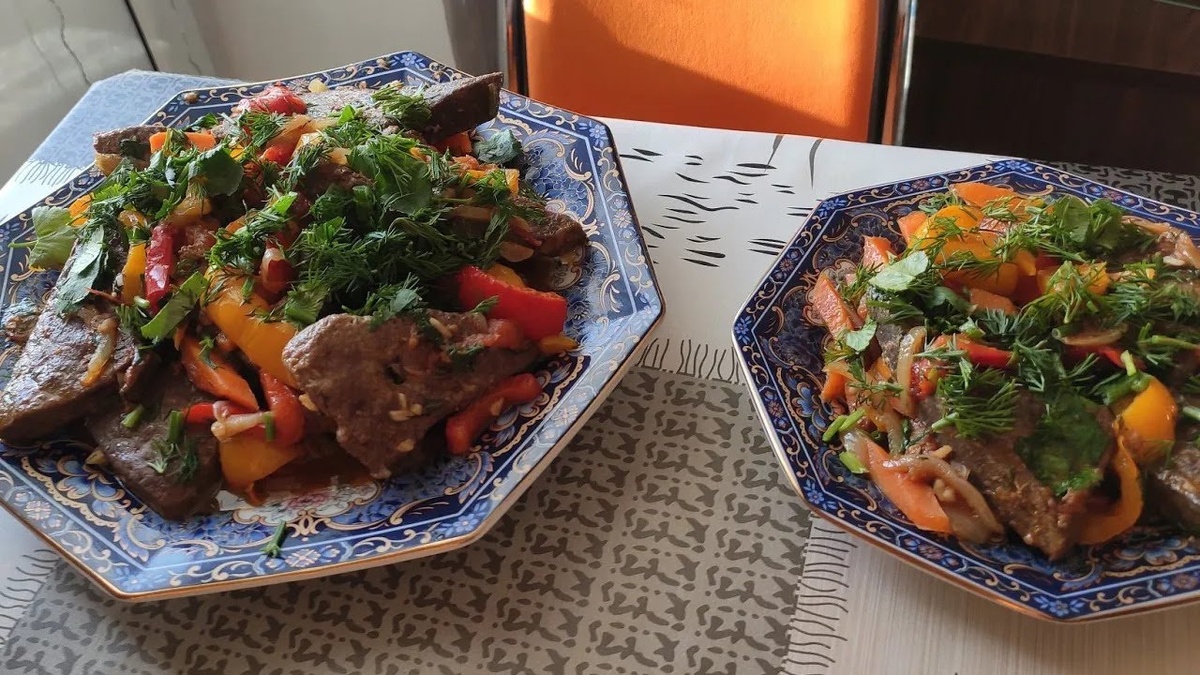 Добрый день, друзья! Добро пожаловать на мой канал! Сегодня с вами будем готовить говяжью печень с овощами. Блюдо получается очень вкусным, благодаря специям оно получается с изюминкой. Ингредиенты: Печень говяжья - 1 кг. Лук - 0. 5 кг. Морковь - 2 шт. Перец болгарский - 4 шт Зелень: кинза, укроп - 100 гр Соль - 2 ч.л. черный перец - 1 ч.л. Кориандр - 2 ч.л. Паприка - 2 ч.л Сливочное масло - 60 гр Растительное масло - 50 мл Чеснок - 3 зубчика. Рецепт приготовления: Очистить печень от плёнки и порезать. Замочить в молоке на 30 минут. Порезать лук, морковь, помидоры, болгарский перец обжарить на большом огне до полу готовности. Обжарить кусочки печенки с двух сторон и слегка посолить. Обжаренную печёнку переложить к овощам и про томить с овощами 10 минут под крышкой. Добавить 50 гр сливочного масла. Через 10 минут добавить зелень. Соевый соус, чёрный перец, паприку, кинзу. Чеснок мелко нарезанный. Перемешать. Печень с овощами готова. Приятного аппетита!