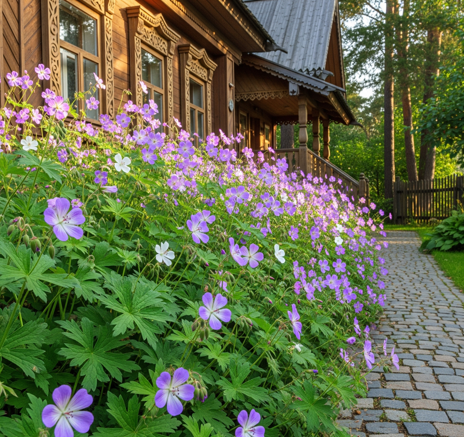 Герань (садовая): это неприхотливое и выносливое растение. Она прекрасно чувствует себя в полутени, не требует обильного полива и не нуждается в защите на зиму. Герань — идеальный выбор для тех, кто ищет надёжный, многолетний цветок для своего сада.