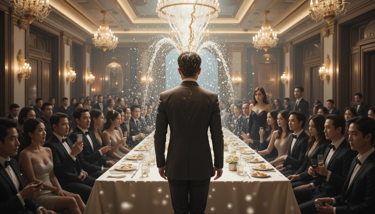 В зале стояла мертвая тишина, нарушаемая лишь щелчками затворов телефонов, которые гости спешно достали. Ростислав стоял, как истукан, не в силах вымолвить ни слова. Его лицо стало белее скатерти на столе.