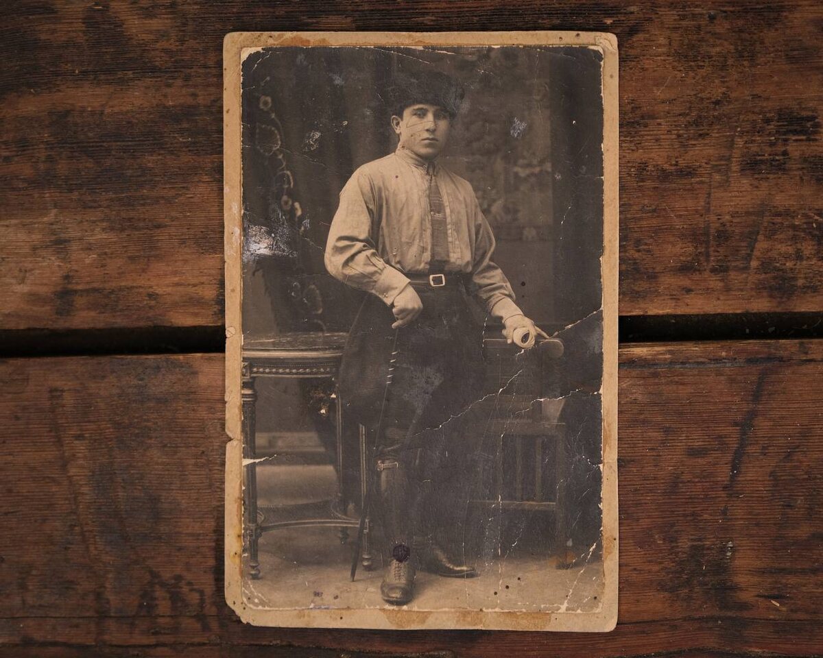 До реставрации бумага на фотографии оказалась пересохшей и ломкой, на поверхности снимка шли глубокие заломы и трещины, заметны следы заломов через всё изображение. Изображение потускнело, контраст пропал, а тёмные участки лица и одежды сливались в одно пятно. Оборот фотографии также пострадал – углы старого картонного стёрлись и стали ломкими. В процессе реставрации специалисты провели влажно-механическую правку бумаги, аккуратно разгладили заломы и укрепили слабые участки основы. Очистили поверхность от пыли и микрозагрязнений, локальное восстановили трещины, ретушировали утраты изображения точным подбором тона. Старый, повреждённ