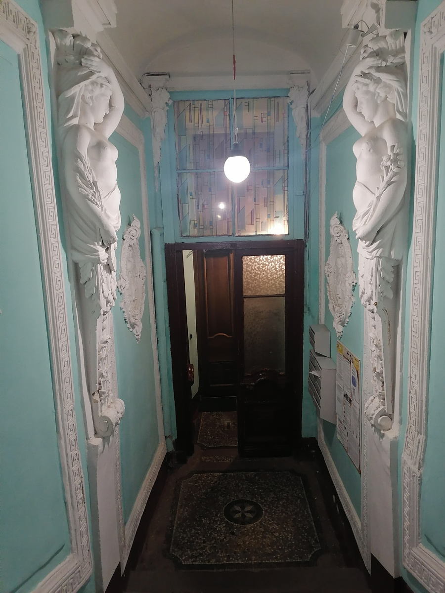 Первая в моем списке — впечатляющая парадная с кариатидами, медальонами с ангелочками и лепными элементами.