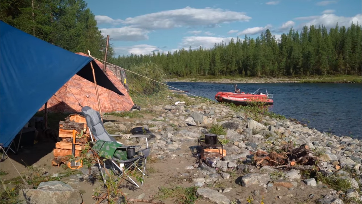 Место для лагеря выбрали идеальное: небольшой островок, окружённый высокими деревьями, с удобным выходом к воде. Палатку поставили прямо на мягкой подстилке из прошлогодней хвои, разложили вещи и приготовили кострище. Вечером, сидя у огня, слушали звуки тайги — шелест листьев, крик совы да плеск рыбы в реке.