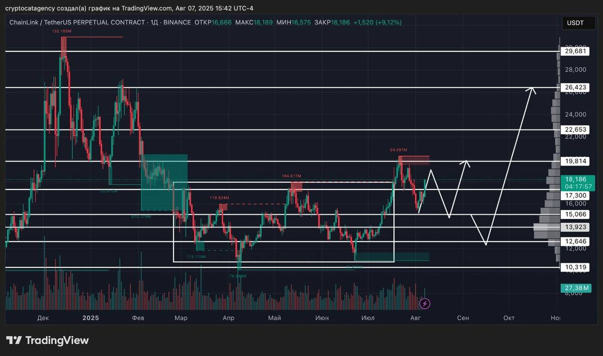Цена достигла сопротивления на уровне 19.814$, после чего началось движение вниз. Лично я считаю текущую коррекцию временем для покупок не только Chainlink, но и других альткоинов. Уровень 15.066$ является ключевым уровнем поддержки, и если цена снизится к этому уровню - можно рассматривать вход в сделку на спот и/или фьючи. Если цена упадёт глубже, то добирать можно в диапазоне 12.646$ - 10.319$ (я уже выставил дополнительно отложенные ордера в этом диапазоне). Цели: 22.653$, 26.423$, 29.681$