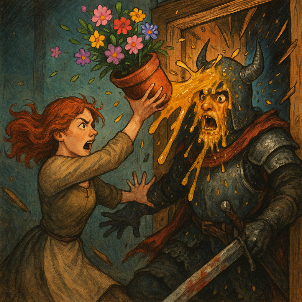 Раздался треск, и дверь разлетелась вдребезги. Когда в помещение ворвался огромный мужчина с густой бородой и в вычурном кафтане с золотым шитьём, я со всей силы обрушила ему на голову горшок. Черепки разлетелись, а маслянистая жидкость потекла по ошеломлённому лицу незнакомца, ручейками разбежалась по широким плечам и забарабанила тяжёлыми каплями по деревянному полу.