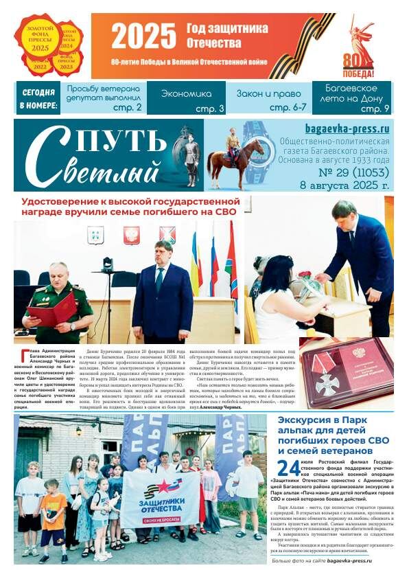 Удостоверение к высокой государственной награде вручили семье погибшего на СВО — стр. 1 Экскурсия в Парк альпак для детей погибших героев СВО и семей ветеранов — стр. 1 Ветеран Великой Отечественной войны из п. Дачный получил помощь в ремонте жилого помещения — стр. 2 Свет православия. Успенский пост начинается 14 августа — стр. 2 В ст. Манычской подвели итоги работы за 1-е полугодие 2025 года — стр. 6 «Вместе мы сильнее!»: вклад волонтеров в успех военной операции неоценим — стр. 8 Маленькие олимпийцы: в детском саду «Светлячок» прошли летние игры — стр. 10 Открытая тренировка по борьбе в Багаевской: закалка тела и духа — стр. 11 Сборная команда Багаевского района выиграла «серебро» на Первенстве Ростовской области 2025 года по шахматам — стр. 16 Номер газеты от 1 августа 2025 года содержит и другие интересные материалы. Напоминаем: продолжается подписка с доставкой Почтой России на 2-е полугодие 2025 года на газету «Светлый путь» с сентября. Офисную подписку можно оформить с любого н