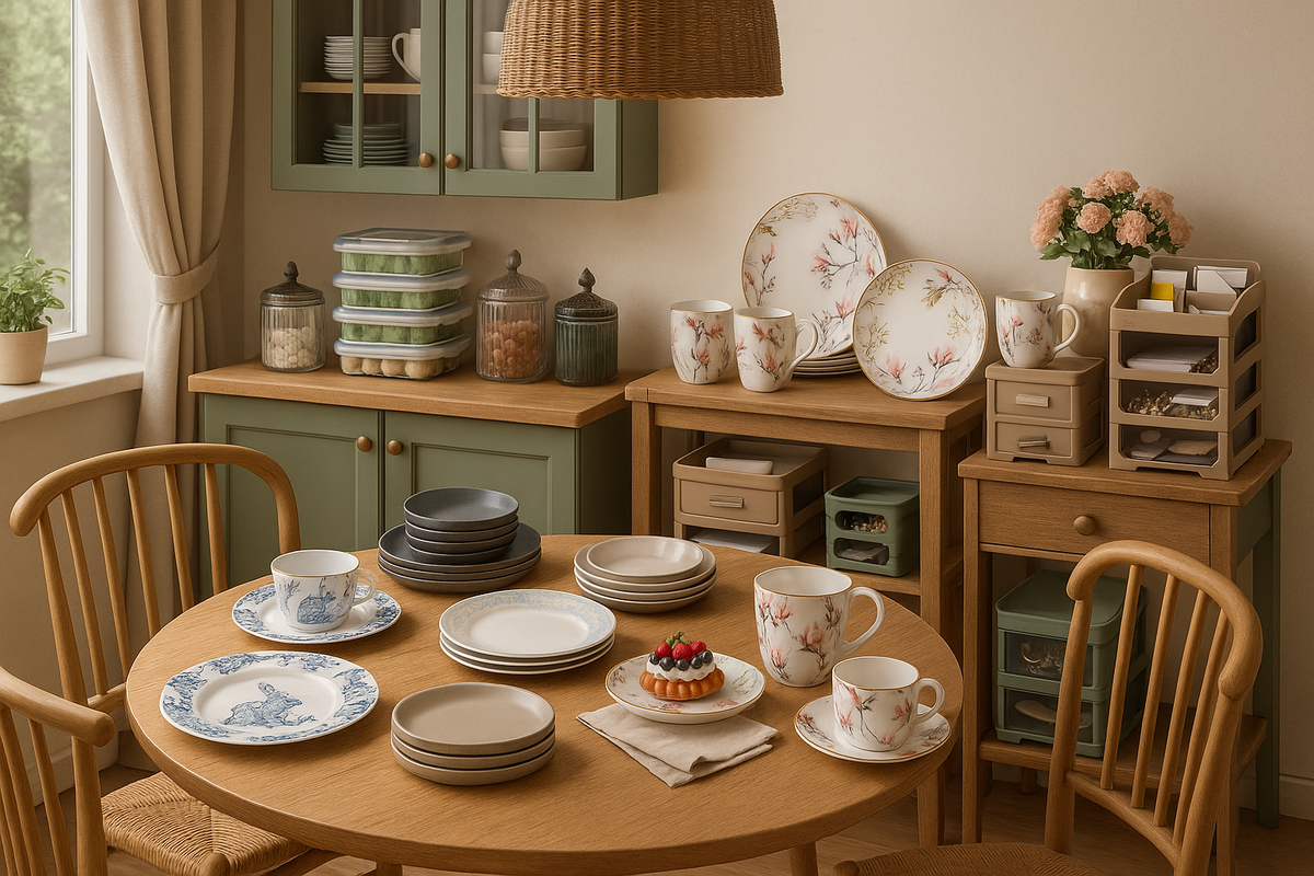 - Для стиля кантри или прованс: сервиз с кроликами, деревянные подставки и органайзер в тёплых бежевых тонах.