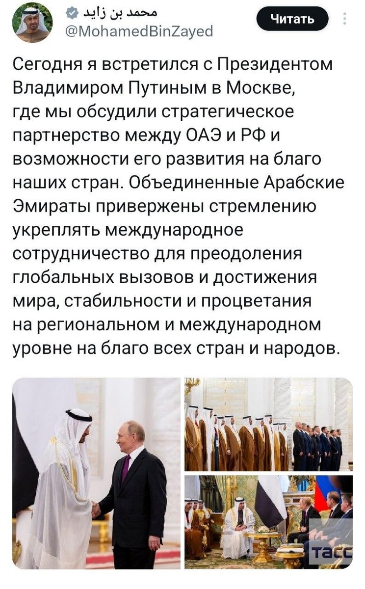 Президент ОАЭ Мухаммед бен Заид Аль Нахайян опубликовал пост на русском после встречи с Путиным.