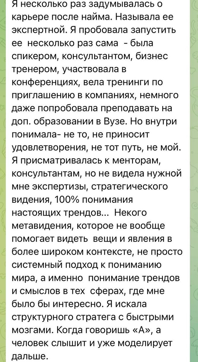 «Проблема в том, что обычно консультанты рекомендуют делать 50 резюме, писать в почты компаний напрямую, переделать сопроводительное и т.д. Пока использовал сарафан и связи и они дают эффект. А вот это вот всё - почти не работает. Так что есть вопрос в осмысленности» - так очень прямо топы говорят о своем недоверии к консультантам. Ну и в общем правильно делают.