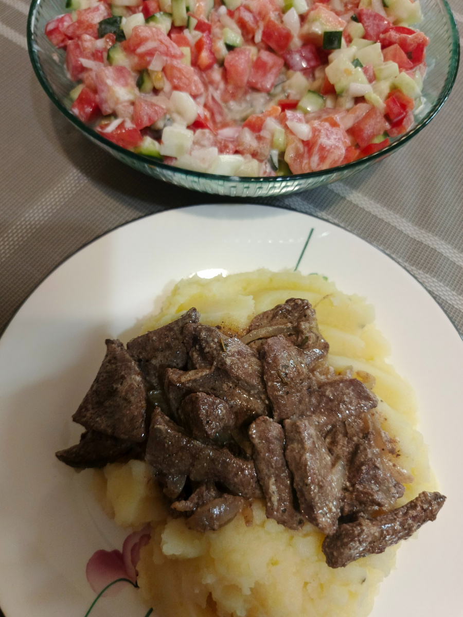 Здравствуйте! Очередная неделя подошла к концу, точнее, рабочая неделя. Я настолько устала от первой недели отпуска, что просто валюсь с ног. Во-первых, по развлечениям, во-вторых, домашние дела. Два дня с перерывами ушло на домашние заготовки. О том, какие полуфабрикаты удалось приготовить, напишу отдельно. Но, судя по всему, ближайшее пару месяцев в моих публикациях будет фигурировать индейка. Как уже говорила, у нас в доме новый житель. Кот Ержан, который изначально звался просто Кузя. Но Ержан, по мнению моих мужчин дома, ему подходит как нельзя лучше. Кто знает этот мем, тот поймет. Теперь дел прибавилось. Только на этой неделе я дважды пылесосила и дважды мыла пол. Плюс этот... нехороший человек сбрасывает с подоконника мои цветы, чем не добавляет себе очков) В общем, весело живем. Что касается ужинов, то готовила я вот что Классика жанра в моем исполнении. Печень в разных вариациях готовлю часто, этот рецепт тоже. Муж особенно любит подобное с картофельным пюре. Так что было реш