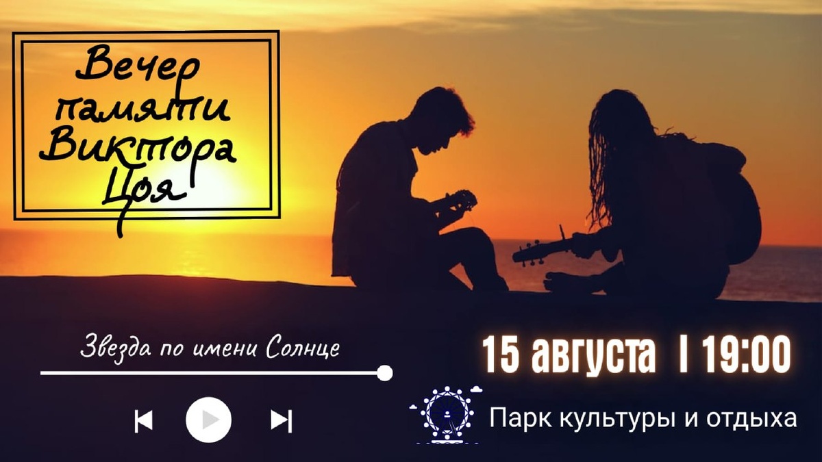15 августа в 19 часов в парке культуры и отдыха состоится концерт, посвященный памяти музыканта, поэта и солиста группы «Кино» Виктора Цоя. Творческие коллективы, желающие принять участие в фестивале, могут обратиться по телефону 8-927-969-13-88 (менеджер парка культуры и отдыха Ирина Акулинина). (16+)