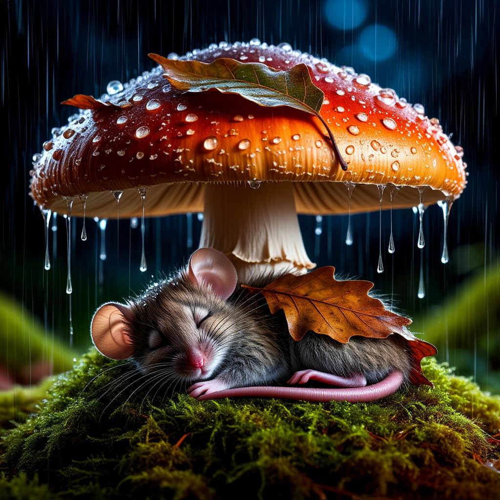 В далёком-далёком лесу, где деревья шепчут сказки, а мох мягче самых пушистых подушек, жил-был маленький мышонок по имени Тимка. Он был самый ласковый и любопытный мышонок на свете. Каждый день он исследовал лес: собирал жёлуди, слушал песни птиц и прятался от дождя под большими листьями. Однажды, когда серая туча закрыла солнце и по лесу застучал тёплый летний дождик, Тимка оказался далеко от дома. Он заспешил искать укрытие — и вдруг увидел перед собой огромный гриб с красной шляпкой в белых крапинках. Это был мухомор, но не простой, а волшебный: добрый и заботливый. Тимка юркнул под его широкую шляпку и затаился. — Не бойся, — прошептал гриб. — Здесь тебе не страшен дождь. Отдохни. Мышонок устроился на мягком мху у основания гриба и уютно свернулся клубочком. С дерева упал жёлтый лист и укрыл его, словно одеяльцем. Дождь барабанил по шляпке, будто колыбельная, а вокруг звенели падающие капли. Но Тимке было тепло и сухо. Он закрыл глазки и быстро уснул. Во сне к нему прилетели лесные