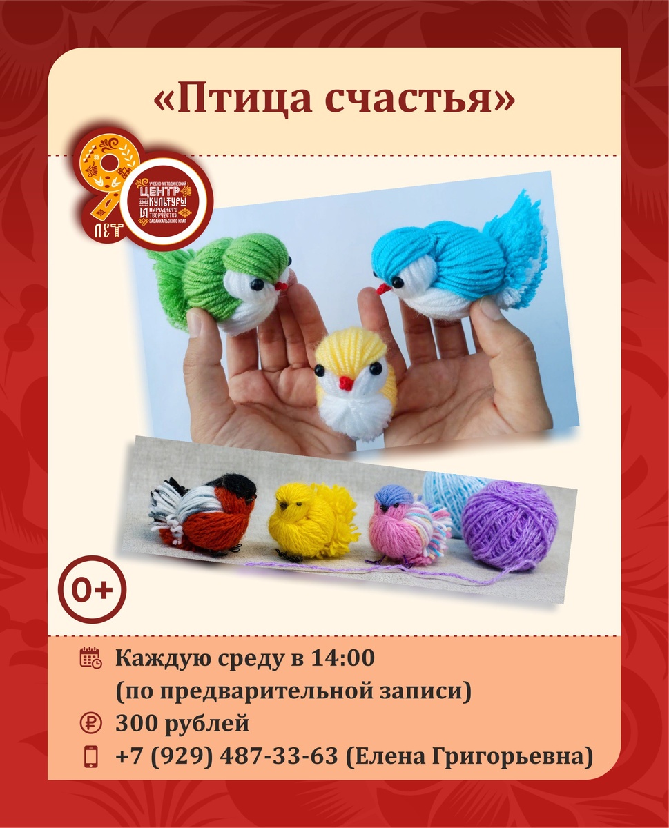 📣 Приглашаем на мастер-класс «Птица счастья»! 💫 Быть счастливыми мечтают и маленькие, и взрослые. Люди верят, что на свете есть птица, приносящая на своих крыльях счастье, яркое и радостное, как она сама. Издревле птица считалась хранительницей семейного счастья, благополучия и вестницей весны. "Птица счастья" – оберег, который забирает то отрицательное, с чем человек может войти в дом, и пропускает в дом только хорошее. Раньше этот оберег для дома люди вешали над колыбелью ребенка и тогда ребенок рос спокойным и здоровым. 🪶 Представляем вашему вниманию мастер-класс по изготовлению птицы счастья, которая в свою очередь станет вашим домашним оберегом, символом счастья и процветания! 📆 Когда? - Каждую среду в 14:00 👶 Возраст? - Без ограничений 💰 Цена? - 300 рублей Записаться можно по телефону: +7(929) 487-33-63 (Елена Григорьевна)