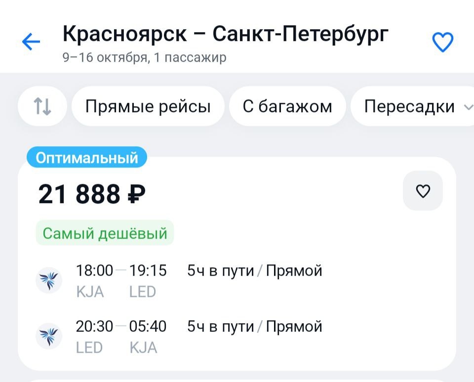 Мелькает такой Петербург от Nordstar в октябре. У нацпера несильно дороже, но в северную столицу билеты меньше, чем за 20к мы если и увидим, то на распродажах. https://aviasales.tpm.lv/7e9aMC1T #LED @KJA