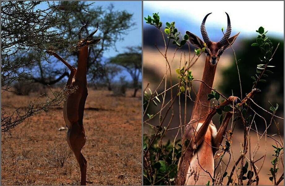Геренук ― антилопа из Африки, которая никогда не пьет воду и ест, стоя на задних ногах