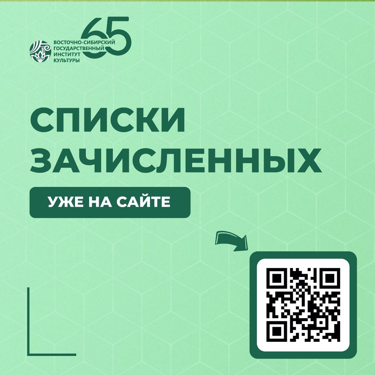 Во ВСГИК прошла процедура зачисления абитуриентов 2025 года набора 💫 6 августа Восточно-Сибирский государственный институт культуры провел процедуру зачисления абитуриентов на бюджетную форму обучения бакалавриата и специалитета. Во ВСГИК зачислено 303 абитуриента на бюджетные места, из них 169 на очную форму обучения и 134 на заочную. Свое желание поступить в вуз выразили более 1000 абитуриентов из самых разных регионов России: Забайкальский край; Иркутская и Томская области; Республики Саха (Якутия), Тыва, Алтай и Бурятия; Приморский, Пермский и Красноярский края, а также граждане Китая, Японии и Казахстана. На сайте вуза опубликованы списки зачисленных: ➡️ приоритетный этап зачисления: Целевой прием: https://www.vsgik.ru/abiturientam/priyemnaya-kampaniya-2025/spiski-zachislennykh/tselevoy-priem/ Особое право: https://www.vsgik.ru/abiturientam/priyemnaya-kampaniya-2025/spiski-zachislennykh/osoboe-pravo/ Отдельная квота: https://www.vsgik.ru/abiturientam/priyemnaya-kampaniya-202