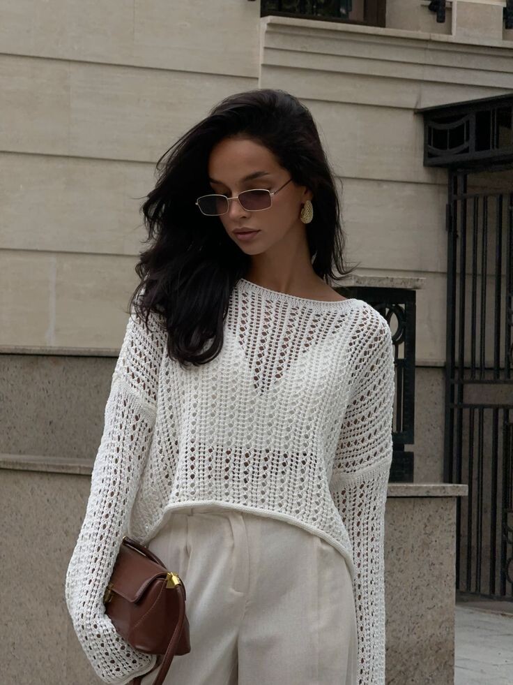 1. Элегантная небрежность (Городской шик): Кремовый ажурный пуловер свободного кроя + Широкие льняные брюки цвета экрю + Эспадрильи на веревочной подошве или модные слипоны + Объемная плетеная сумка + Крупные солнцезащитные очки и деревянные бусы.