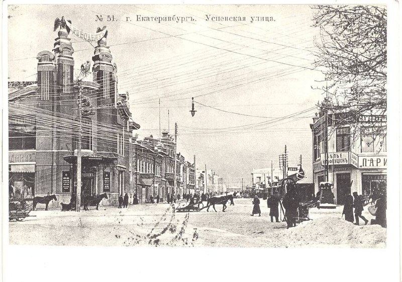 Улица Вайнера, ранее известная как Успенская. Улица относится к числу древнейших артерий Екатеринбурга. В первые годы существования города вдоль неё пролегала крепостная стена заводского поселения. Со временем городские границы были сдвинуты на запад, и улица начала активно развиваться как торговое пространство. Этому способствовали и её владельцы – в большинстве своём купцы, державшие дома по обеим сторонам центральных кварталов. Здесь продавались разнообразные товары: от мануфактуры и галантереи до книг, табака, посуды и готового платья. За Покровским проспектом (ныне улица Малышева) выстраивались постоялые дворы, в которых находили приют приезжие купцы и гости, остановившиеся для торговли. Некоторые из исторических построек дошли до наших дней – например, дом купца Телегина (Вайнера, 14/1), торговый дом братьев Агафуровых (Вайнера, 16), особняк Хребтовой (Вайнера, 26). В начале прошлого века в магазине наследников Бардыгина (Вайнера, 11) размещалась типография «Гранит», а позднее