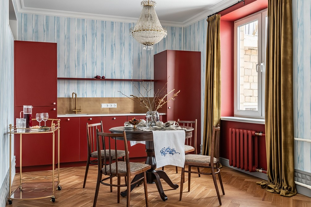 «Такой стиль интерьера я называю “советский шик”, — рассказывает дизайнер. — Это эклектика в чистом виде, где все перемешалось. Винтажная мебель, полосатые современные обои, составной плинтус с 3D-панелями, фартук из латуни. Я люблю эклектику, люблю, когда много деталей. Люблю, когда интерьер вызывает эмоции, и кстати, неважно какие. Если кто-то негативно высказался, а кто-то в восторге — это победа, значит, интерьер получился. Для меня это как искусство — оно должно вызвать эмоцию, желание».