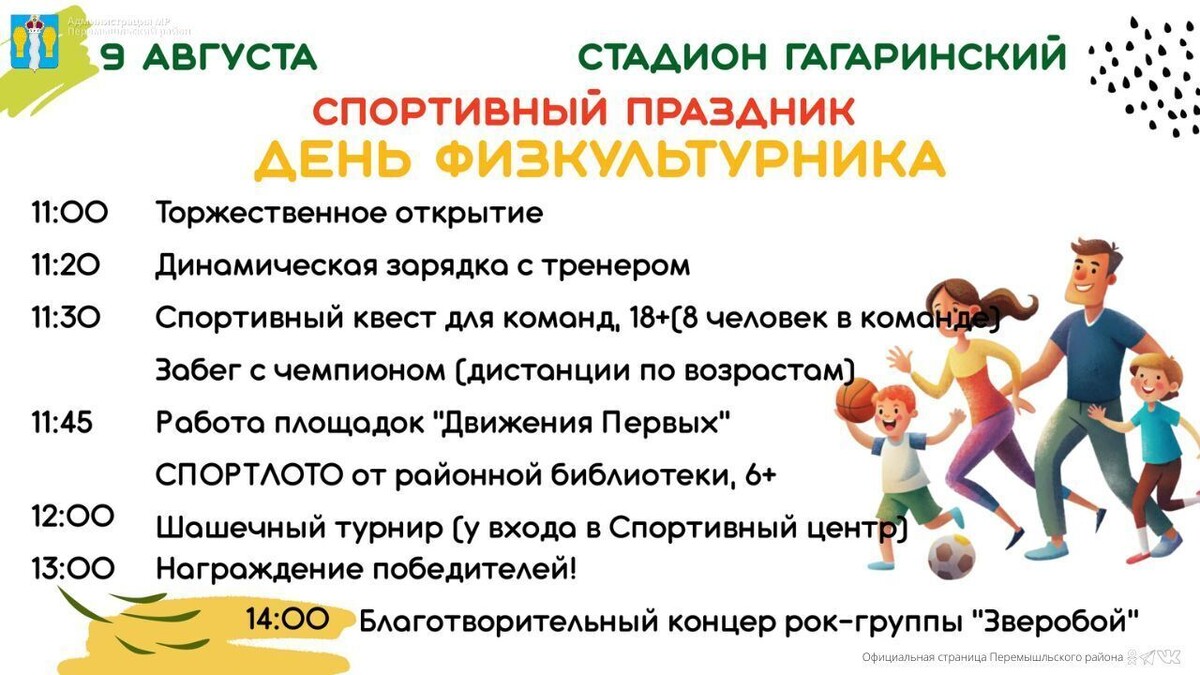 🏃♂️ День физкультурника в Перемышле 9 августа в 11:00 на стадионе «Гагаринский» пройдёт спортивный праздник. Присоединяйтесь – участвуйте или просто поддерживайте спортсменов! Программа: ⏰ 11:00 – торжественное открытие ⏰ 11:20 – зарядка с тренером ⏰ 11:30 – спортивный квест для команд 18+ (8 человек в команде) ⏰ 11:45 – работа площадок «Движения Первых» и спорт-лото от районной библиотеки (6+) ⏰ 12:00 – шашечный турнир у входа в Спортцентр ⏰ 13:00 – награждение победителей ⏰ 14:00 – благотворительный концерт группы «Зверобой» А ещё всех ждёт вкусный плов😋 Приходите за движением, эмоциями и отличным настроением! #День_Физкультурника #Перемышль