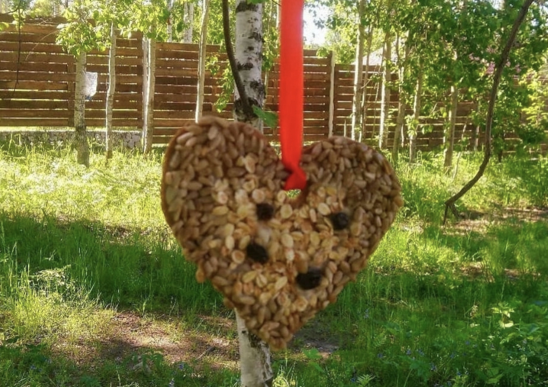 Затем промазываем заготовку густым слоем клейстера. Насыпаем «птичье лакомство» (семечки, пшено, зерно) на клейстер и слегка прижимаем.