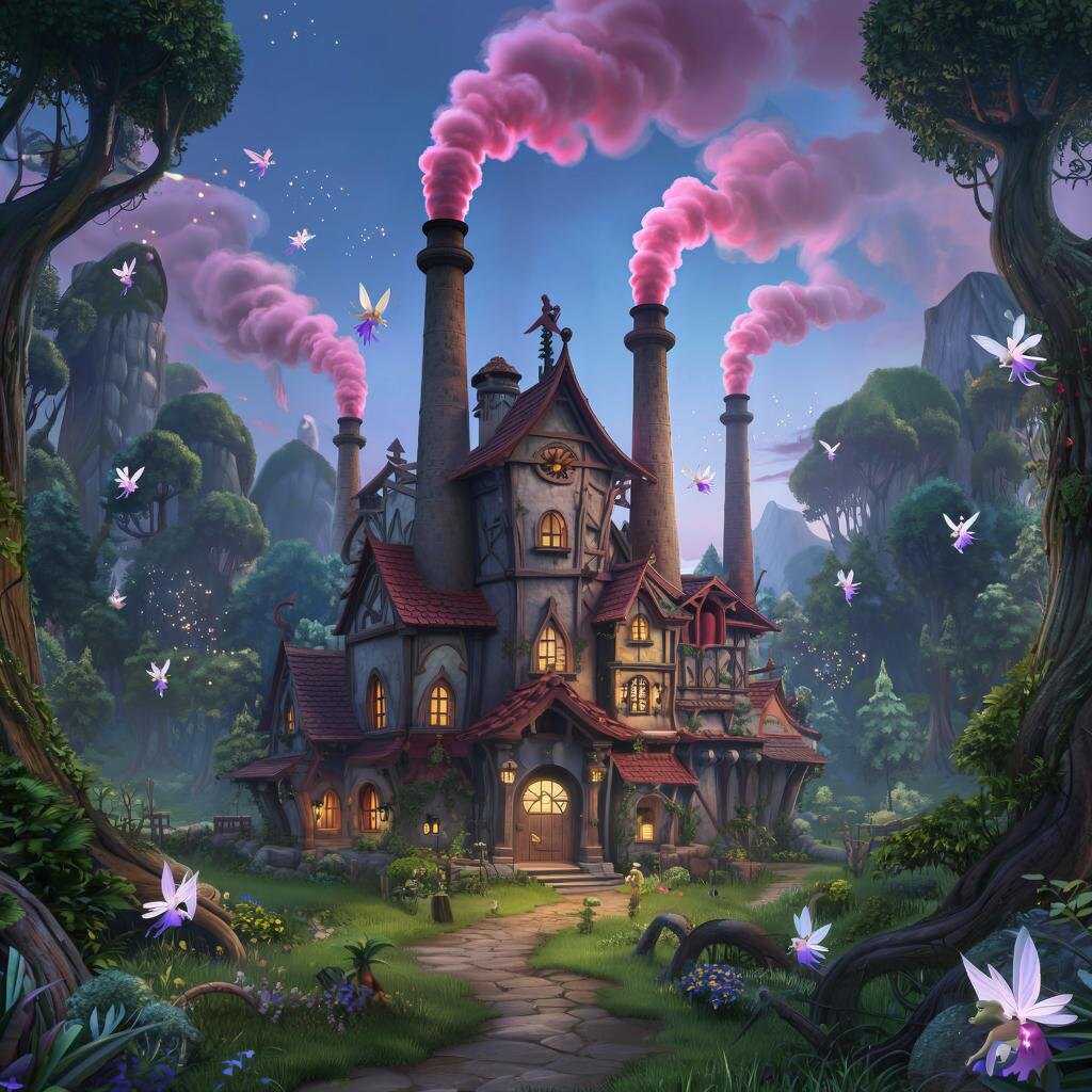 В гуще зачарованного леса, где могучие деревья перешептывались древними тайнами, возвышалось невиданное прежде творение искусственного интеллекта – воссозданный по мотивам мультфильма о Шреке завод Феи-крестной. Из его высоких, витых труб клубился не черный дым промышленности, а розовые, искрящиеся облака волшебства. А у входа, порхая на изящных крылышках, сновала сама Фея-крестная, словно и не покидала это место с тех пор, как ее сказочное предприятие превратилось в руины. Что же задумала хозяйка волшебного завода? Какие зелья и чудеса теперь варятся в его магических котлах?