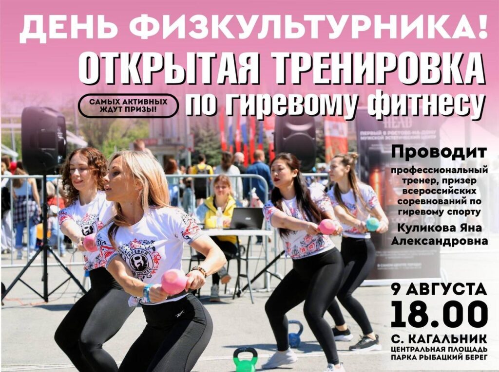 В преддверии Дня физкультурника, 9 августа, в селе Кагальник Азовского района состоится массовая открытая тренировка. Мероприятие организовано Центром тестирования ГТО Азовского района, клубом «Гиревой фитнес» и отделом по делам молодежи Администрации Азовского района. Для участников подготовлена насыщенная спортивная программа. Ключевым событием тренировки станет мастер-класс по выполнению норматива «рывок гири» из комплекса Всероссийского физкультурно-спортивного комплекса «Готов к труду и обороне» (ГТО). Профессиональные инструкторы продемонстрируют технику упражнения и ответят на вопросы. Мероприятие пройдет: Организаторы приглашают всех жителей и гостей Азовского района, независимо от возраста и уровня подготовки, присоединиться к празднику спорта и здорового образа жизни.
