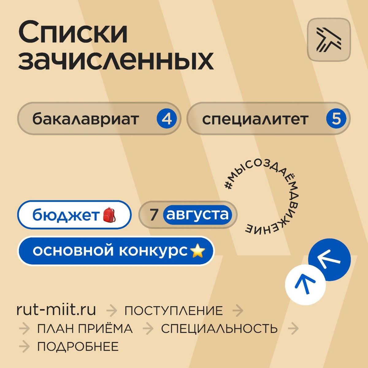 Опубликованы списки зачисленных в Российский университет транспорта ⚡️, поступивших по основному конкурсу на бюджет по программам бакалавриата и специалитета. Зелёные списки размещены на нашем сайте в разделе «План приёма» по ссылке на страницах специальностей во вкладке «Общий конкурс». Поздравляем с поступлением в главный транспортный вуз страны! ✔️ Для поступления на платную основу необходимо заключить договор до 12:00 22 августа. Списки зачисленных на платную основу обучения будут опубликованы 26 августа. ➡️Информацию о собраниях с первокурсниками и навигатор первокурсника разместим в ближайшее время. Подписывайтесь и следите за обновлениями! Будь в курсе собыйти РУТ