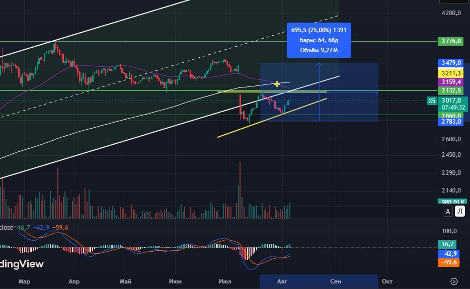 #X5 ↗️ Тренд входящий. Ранее писала, (говорила на трансляции в среду), что шли в канале на повышение, сейчас цена вышла из канала, но строит разворот на фигуру. 🕯Треугольник с прямой стороной. Отработка до 3 519, вероятнее всего, цена в канал вернётся. 🔼При возвращении в канал - следующий уровень сопротивления 3 532, я думаю, что после отработки туда доползет, а дальше пойдёт обновлять предыдущий максимум 3 776. ✔️Подтверждением фигуры будет пробить 3 115 и закрепления выше этого уровня. НЕ ИИР #теханализ #трейдер #х5