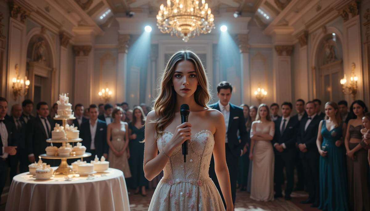 Алиса посмотрела в зал. Десятки глаз были устремлены на нее. Она увидела камеры, вспышки. Она посмотрела на Дамира, на его идеальное лицо, на его фальшивую улыбку. И она начала говорить. Ее голос был тихим, но чистым и твердым. В зале мгновенно наступила тишина.