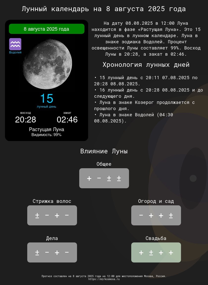 Лунные календари на 8 августа 2025 года: Подготовьтесь к этому дню с учетом влияния Луны! 🔹🌗 Лунный календарь на 8 августа 2025 года — Что приготовила Луна? Подробнее 🔹✂️ Лунный календарь стрижек на 8 августа 2025 года — Подходящий ли день для обновления прически? Подробнее 🔹🌱 Лунный календарь огородника и садовода на 8 августа 2025 года — Лучшее время для ухода за растениями. Подробнее 🔹📅 Лунный календарь дел на 8 августа 2025 года — Удачные моменты для важных задач. Подробнее 🔹💍 Лунный календарь свадеб на 8 августа 2025 года — Подходит ли этот день для вашего торжества? Подробнее