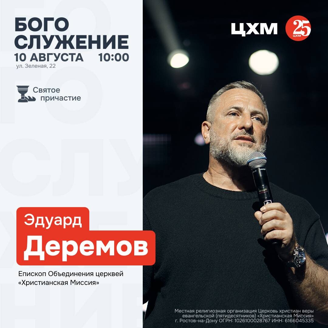 БОГОСЛУЖЕНИЕ 10 АВГУСТА В 10:00 ⛪️ Приходите на встречу с Господом, провести время в молитве, единстве и общении Богослужение проведет Епископ Объединения церквей «Христианская Миссия» - Эдуард Деремов 🙌✨ до служения проходит молитва в 9:30 ждем вас «Шесть дней ешь пресный хлеб, а на седьмой день проведи собрание Господу, твоему Богу, и не делай никакой работы.» Второзаконие 16:8 НРП Благословляем вас и приглашаем на богослужение! Адрес: Зеленая 22 🖥 ВКонтакте «Цхм Ростов» трансляция служения — https://vk.com/cxm.rostov 🖥 РУТУБ «Цхм Ростов» трансляция служения — https://rutube.ru/channel/39499224/ 🖥️ YouTube «Цхм Ростов» трансляция служения - https://youtube.com/@cxmrostov?si=gSKP3_oMbfVza0gg