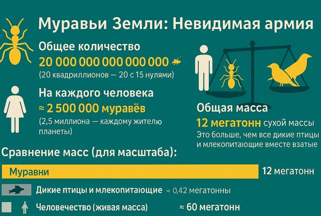 Вы уверены, что люди — главные хозяева нашей планеты? Вполне возможно, что мы всего лишь временные гости на территории, которую вот уже 100 миллионов лет контролирует другой вид. Они незаметны, неутомимы и повсеместны. Муравьи обитают на всех континентах, за исключением Антарктиды. Они никогда не спят, но при этом способны организовывать фермы, вести войны и даже совершать перевороты. Но самое удивительное — их количество. Оно не просто велико, оно ошеломляет. Согласно исследованию международной команды биологов (2022), на Земле проживает около 20 квадриллионов муравьёв. Это число с пятнадцатью нулями. Если распределить их равномерно, на каждого человека придётся более 2,5 миллионов особей. Трудно представить? Тогда другой факт: их общая сухая масса составляет примерно 12 мегатонн — это больше, чем вес всех диких птиц и млекопитающих вместе взятых. Муравьи — истинные мастера адаптации. Они встречаются в лесах, степях, горах, пустынях и даже в городских парках. Особенно много их в тропи