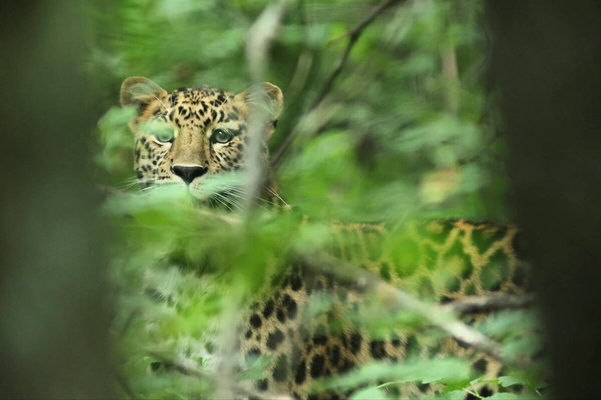 Редкая встреча произошла в центральной части нацпарка: сотрудники совершали полевую работу по проверке фотоловушек на автомобиле по лесному массиву, когда неожиданно повстречали пятнистую кошку. Распознав присутствие человека поблизости, леопард незамедлительно скрылся и затаился в кустах в 10-15 метрах.