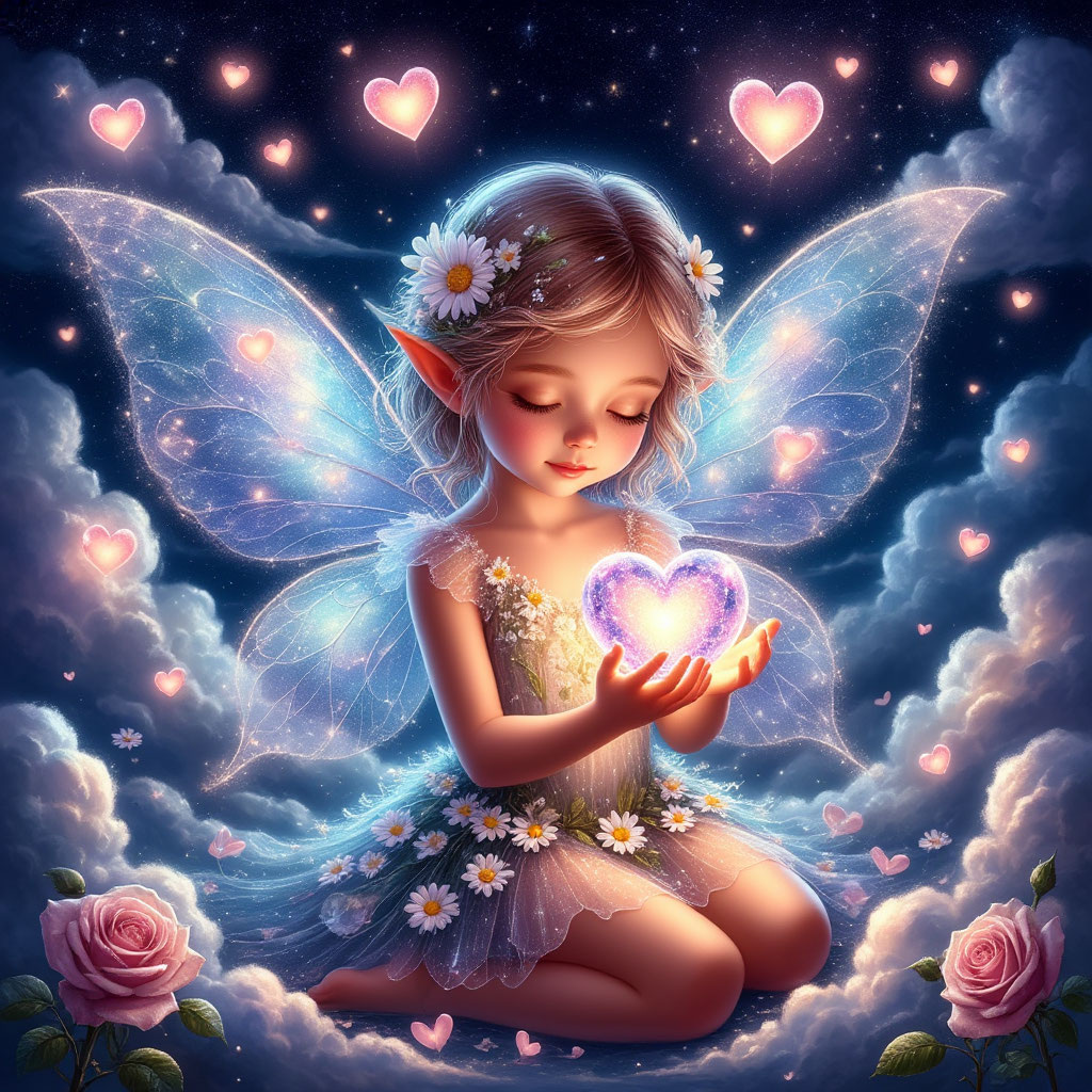 Высоко-высоко над землёй, там, где облака становятся пушистыми, как сахарная вата, жила маленькая фея по имени Лили. Её крылышки переливались, как утренняя роса, а платье было соткано из лунного света и лепестков ромашек. Она была хранительницей самых добрых снов. Каждый вечер, когда солнце касалось горизонта, Лили взбиралась на своё любимое облако и поднимала в небо волшебный шар в форме сердца. Внутри него цвела светящаяся роза — её тёплый свет помогал снам находить дорогу к детям. — Ещё один день прошёл, — шептала фея, — пора подарить утешение тем, кто грустил, и смелость тем, кто боялся. Она взмахивала крылышками, и в тёмное небо разлетались искорки-сердечки. Они опускались на землю: на подушки, в сложенные для молитвы ладошки и прямо в сердца. Иногда ребёнок, проснувшись ночью, вдруг чувствовал, как его окутывает тепло. Другому, мучимому кошмаром, внезапно начинали сниться зелёные луга и смех. А кто-то просто улыбался во сне, не подозревая, что высоко в облаках сидит фея Лили и за