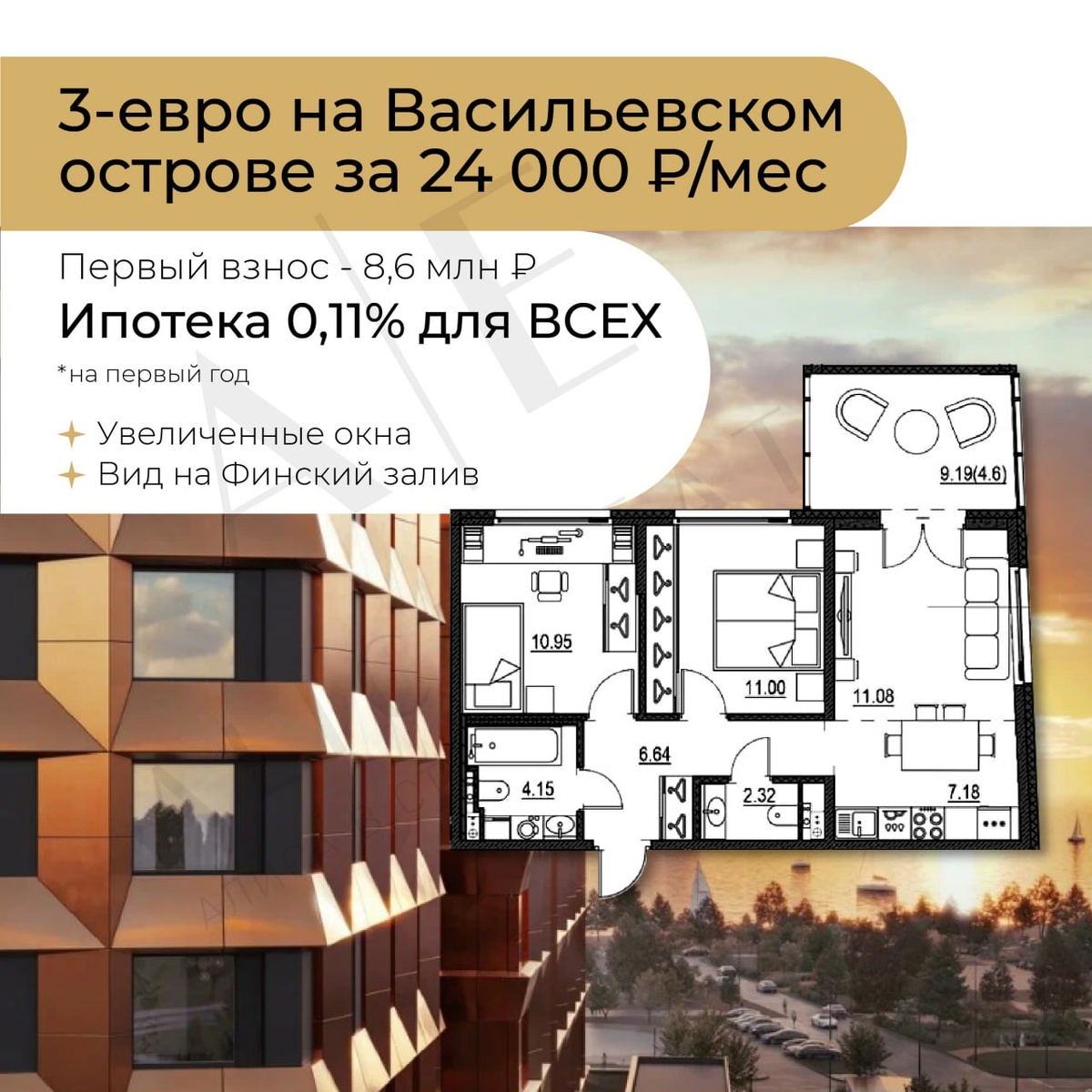 🔥 3-евро на Васильевском острове за 24 000 ₽/мес для всех