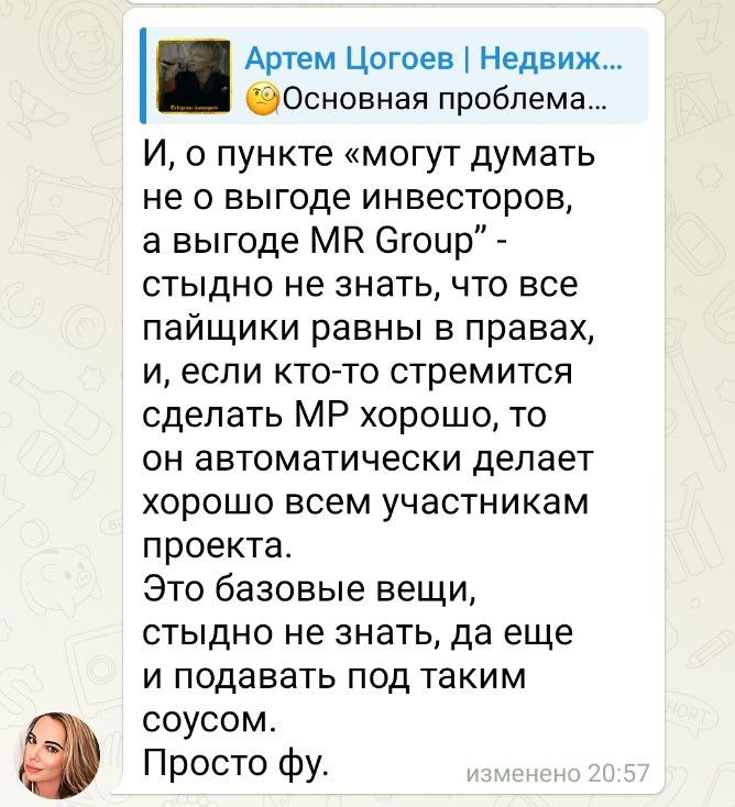 ✍️ Бывшая директор по работе с инвесторами MR Group Юлия Перменева (я не знаю ее должность в «АБ Капитал» сейчас) решила прокомментировать мой вчерашний пост https://dzen.ru/media/atsogoev/osnovnaia-problema-zpif-kombinirovannyi-djois-68945dc21095457cd8b8335c Разберу её заявление: 1️⃣ «Все пайщики равны в правах» - да, но если УК действует в интересах девелопера, то все пайщики равно страдают от этого. 2️⃣ «Делая хорошо MR, автоматически делает хорошо всем» - это фундаментально неверно. Интересы девелопера и инвесторов часто оказываются противоположны, а управляющая компания ВСЕГДА И ПРИ ЛЮБЫХ ОБСТОЯТЕЛЬСТВАХ ДОЛЖНА работать в интересах инвесторов. Функция «АБ Капитал» - не служить финансовым пылесосом для MR Group, а приумножать средства своих доверителей, частных инвесторов. ⚠️Почему это всё важно. Такие схемы подрывают доверие к институту коллективных инвестиций и ЗПИФов в целом. Инвесторы должны понимать: когда они покупают паи фонда, управляемого «АБ Капитал», их интересы могу