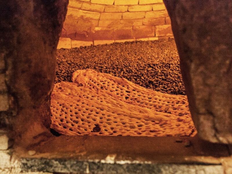 Иранский хлеб, что-то среднее между фокаччей и лавашом. Дрожжевое тесто раскатывают, а потом разминают руками тонко-тонко, смазывают маслом и выпекают в печах, засыпанных мелкой галькой.