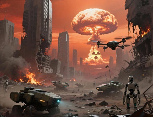 Первые ядерные взрывы прогремели в течение первых сорока минут. Столицы исчезли. Москва, Вашингтон, Пекин, Лондон, Париж — всё превратилось в ослепительные грибы, раскрывшиеся над землёй, как цветы апокалипсиса. Люди не успевали кричать. Миллионы погибли за час. Потом — ещё больше. Радиация окутала северное полушарие. Дождь стал чёрным. Он пах смертью.